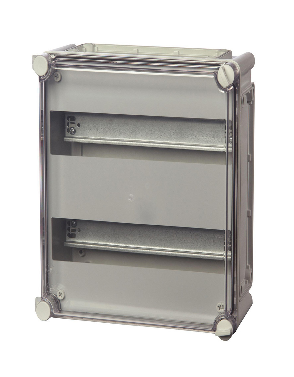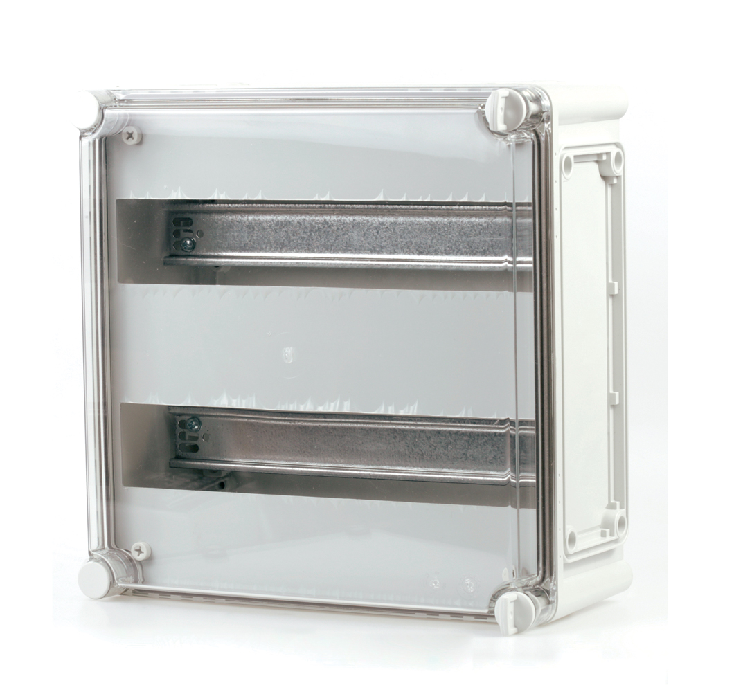 Komplett DIN-skinnekasse med innsats for 2 x 9 moduler. Inkluderer 2 x str. 1 og 2 x str. 2 flenser. Mål: 280x190x130 mm.