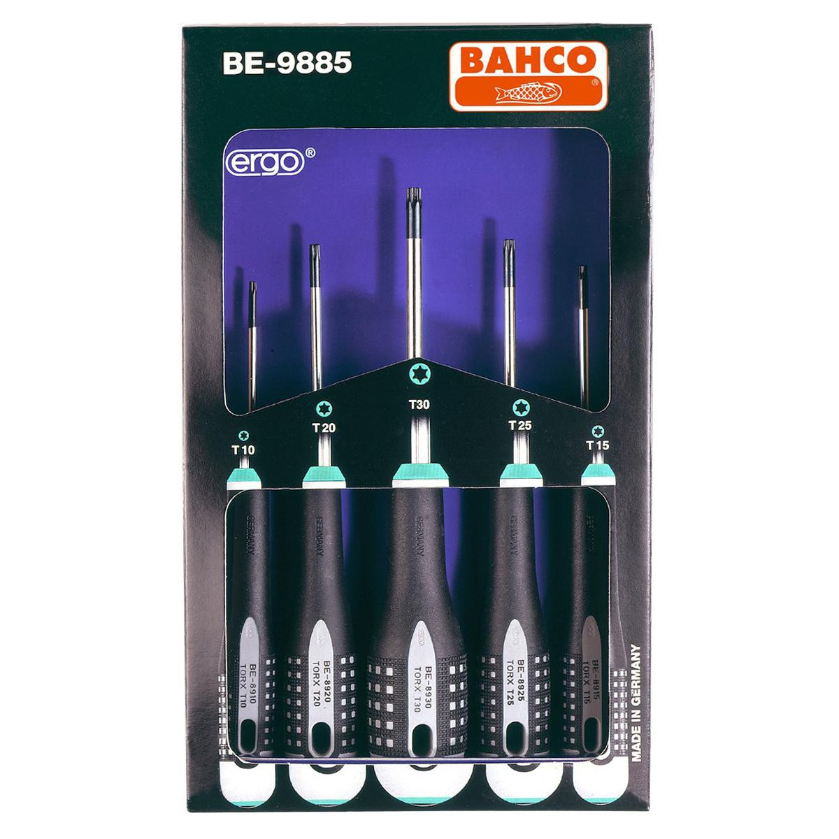 Dette Bahco skrutrekkersettet BE-9885 inneholder 5 skrutrekkere med Torx® spor, som er designet for å gi optimal komfort og ytelse under bruk.