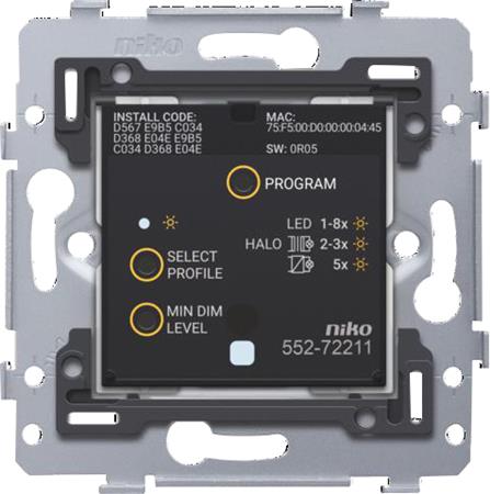 Smart dimmeren Zigbee® inneholder en dimmerbryter for betjening av belysningen. Den inneholder en trådløs sender og mottaker som kommuniserer med det trådløse smart-hub (552-00001) for Niko Home Control.