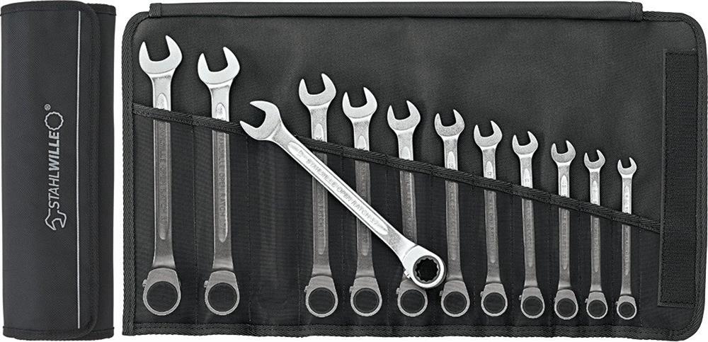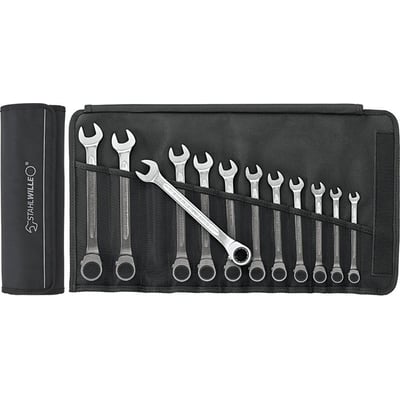 Robust skrallegaffelnøkkelsett med 12 deler. Dobbelt-T-profil sikrer høy lastekapasitet og bøyestyrke ved lav vekt. Ideell for trange rom med 5° arbeidsvinkel.