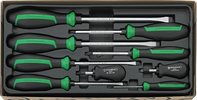 4693/9 Skrutrekkersett 9 deler, 4622: Gr. 1 (1,0 x 5,5 x 100 mm), Gr. 2 (1,2 x 6,5 x 125 mm), Gr. 3 (1,2 x 8,0 x 150 mm), Gr. 4 (1,6 x 10,0 x 175 mm) 4628: Gr. 1 (0,4 x 2,5 x 60 mm) 4632: PH1, PH2 4724: Gr. 2 (1,0 x 5,5 x 25 mm) 4734: PH2, Et gjennomtenkt design og praktiske funksjoner sikrer lang pålitelighet, sikker funksjon og behagelig håndtering. Det flensformede håndstopper forhindrer skader som følge av utilsiktet utglidning og at verktøyet ruller bort. Praktisk. Du kan alltid finne den riktige profilen takket være den praktiske hovedmerking. Individuell. Skrutrekkerens fire grepstørrelser er nøyaktig tilpasset etter utgangsstørrelsene. Robust. Skrutrekkerens kjerne er fremstillet av høykvalitets-polypropylen (PP), som er optimalisert for å motstå slag.