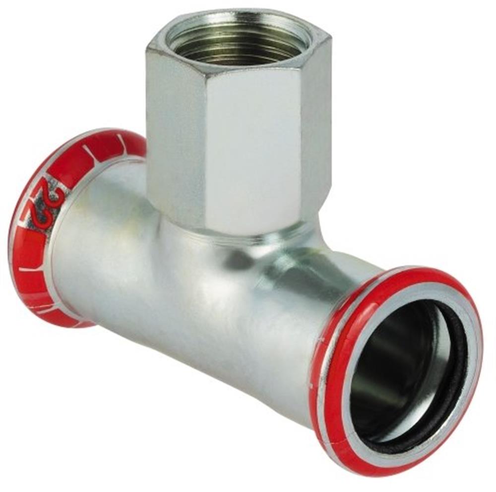 Forzinket stål Tee FZ fra Geberit med innvendig gjenge og presskobling. Brukes til varme-, kjøle- og industrianlegg. Med presseindikator.