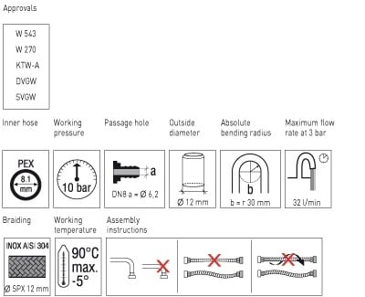 Fleksibel tilkoblingsslange av høy kvalitet for både kaldt- og varmt bruksvann. Kompresjonskoblingen (skjæreringen) kan f.eks. tilkobles direkte til det halvmyke kobberrøret som sitter på noen vannkraner, eller til en PEX-slange med støttehylse. Tåler et trykk på 10 bar ved 90°C.