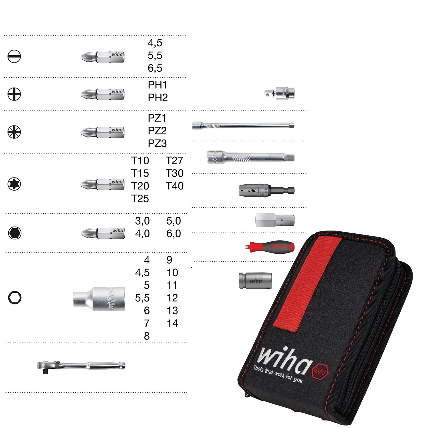 Wiha pipesett og bitsett med 40 deler i funksjonsveske med belteklips. Skrueoppgaver løses enkelt med dette settet, som inneholder de mest vanlige 1/4" pipene i størrelsene 4-14 mm, diverse bits, en bitsholder, en skralle, to forlengere, et kardanledd og en 1/4" pipeadapter.