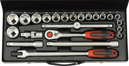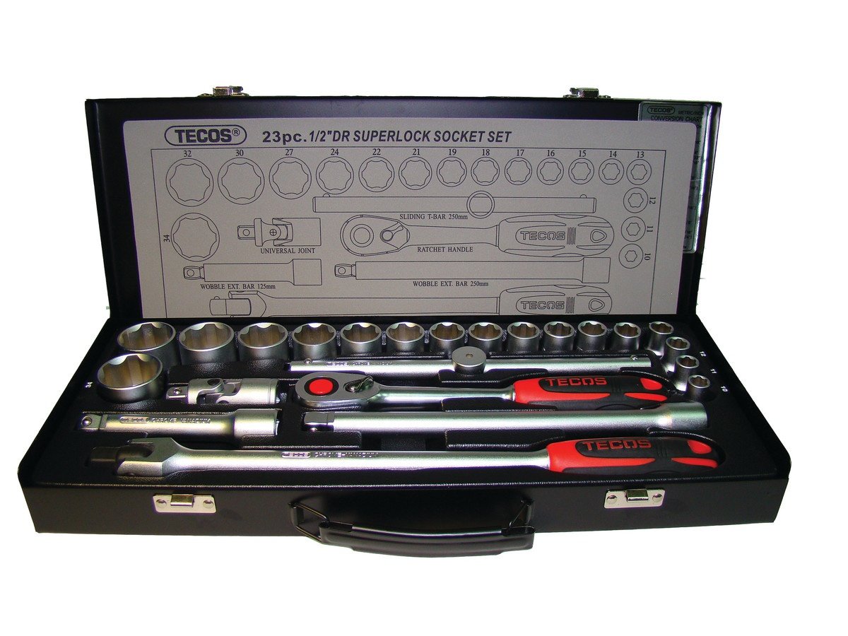 Toppenøkkelsett 1/2" 24 deler T-1224M med Superlock-topper. Industrikvalitet i krom-vanadium stål med flott oljeavvisende finish. Rattnøklene har som standard 72 tenner i 1/2" og 3/8", mens 1/4" leveres med 45 tenner som standard. Firkanten med runde hjørner gjør det enkelt å skifte topper selv etter høy belastning.