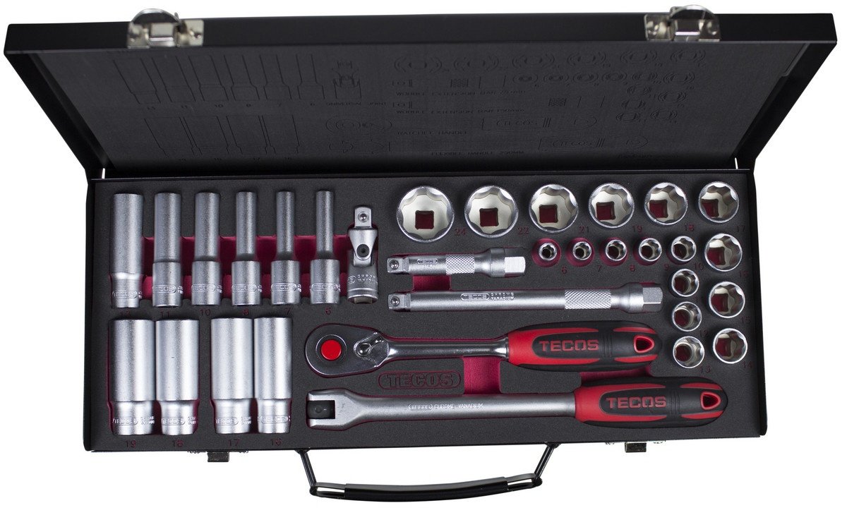 Toppsett 3/8", 39 deler med Superlock topper. Industriell kvalitet i krom - vanadium stål med flott oljeavvisende finish. Firkanten med runde hjørner gjør det enkelt å bytte topper selv etter høy belastning.