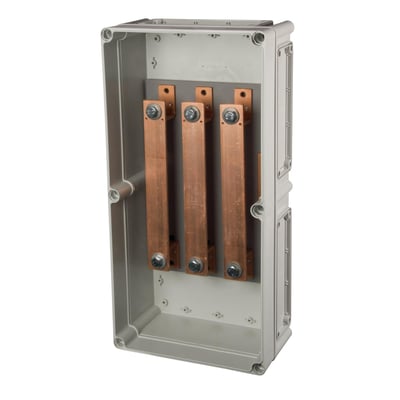 Trafoboks for opptil 6 transformatorer. Denne modellen er dimensjonert for 600A og har en effektiv strøm på 15kA/1s samt en toppverdi på 36kA. Boksen måler 560x280x180 mm og er produsert i polykarbonat.