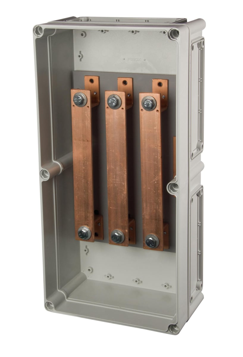 Trafoboks for 6 transformatorer. 600A, 15kA/1s eff., 36kA toppverdi, 560x280x180 mm.