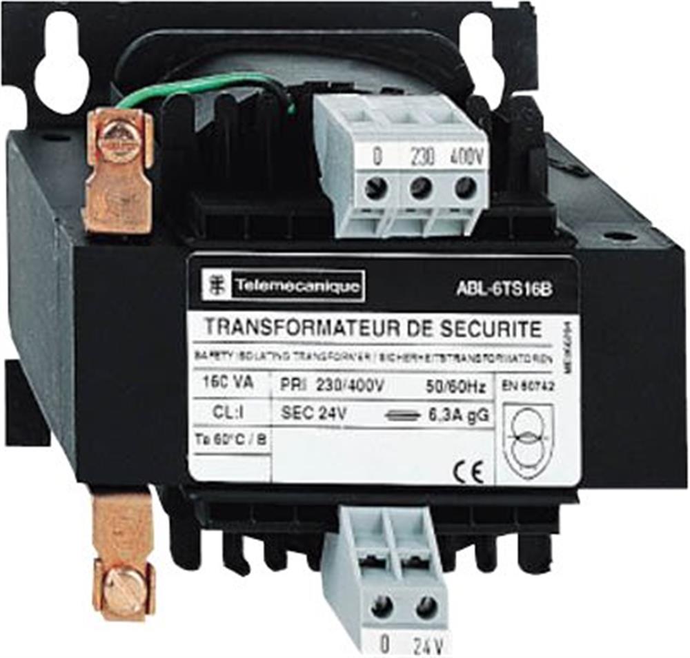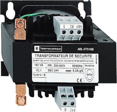 ABL6 transformatoren leverer vekselstrøm til styrekretser, men isolerer dem fra strømnettet. Den har en nominell inngangsspenning på 230 til 400Vac, en nominell utgangsspenning på 24Vac og en nominell effekt på 100VA.