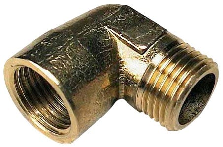 Fitting laget av messing. Har en innvendig og en utvendig gjenge og en vinkel på 90°.
