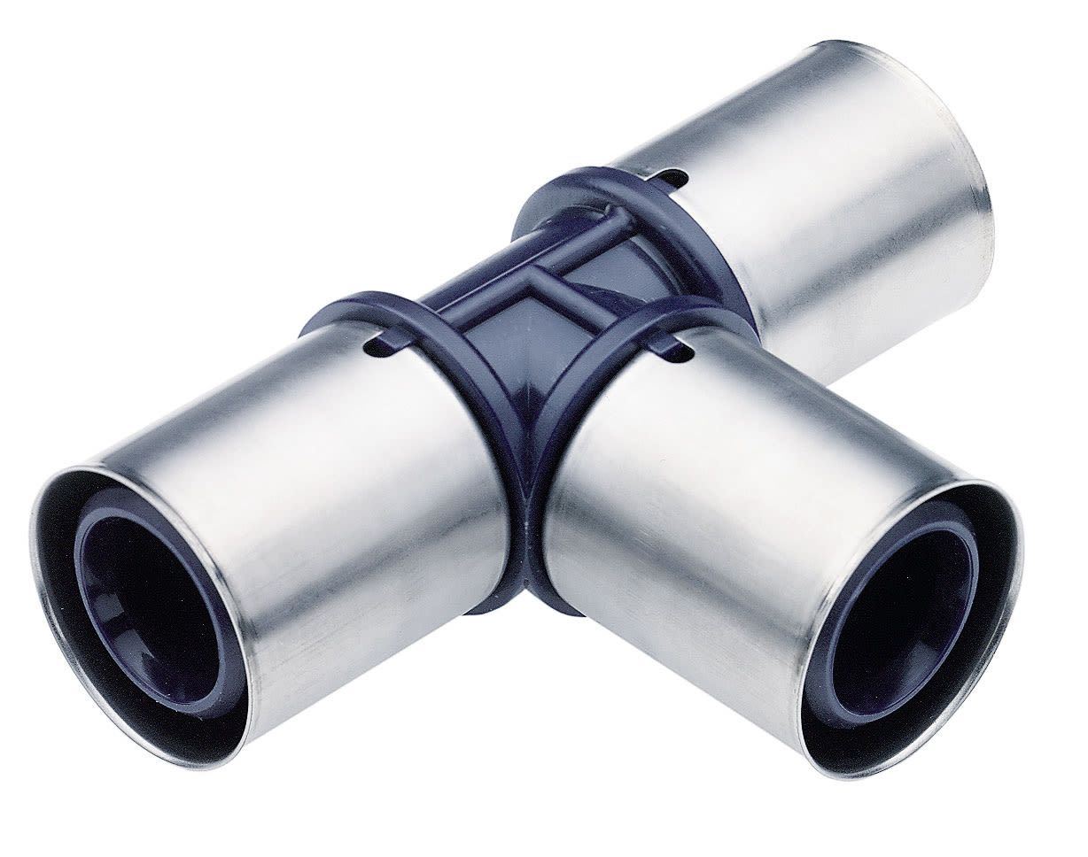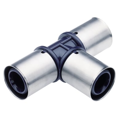 Presskobling som brukes til Tigris Alupex-rør fra Wavin. T-stykke med presskoblinger i begge ender og avgreningen.