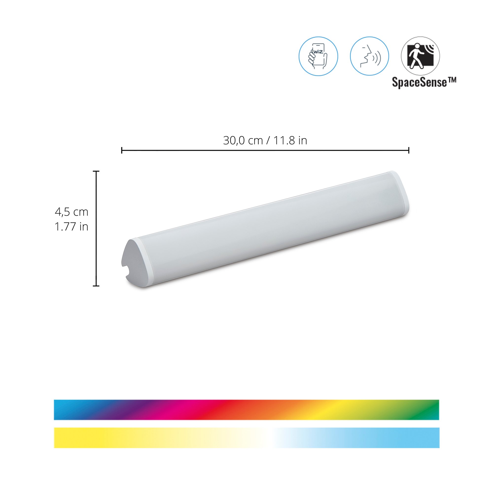 WiZ Color Bar Lineær Lys er med til å gi nytt liv til enhver overflate. Den slanke lampen lyser opp ethvert rom med sine mange valg av fargekombinasjoner. Den er praktisk, da den er liten og slank, og kan derfor passe inn de fleste steder i hjemmet ditt. Last ned WiZ-appen som er helt gratis, hvor du enkelt kan kontrollere og styre lyset ditt via stemmekontroll.