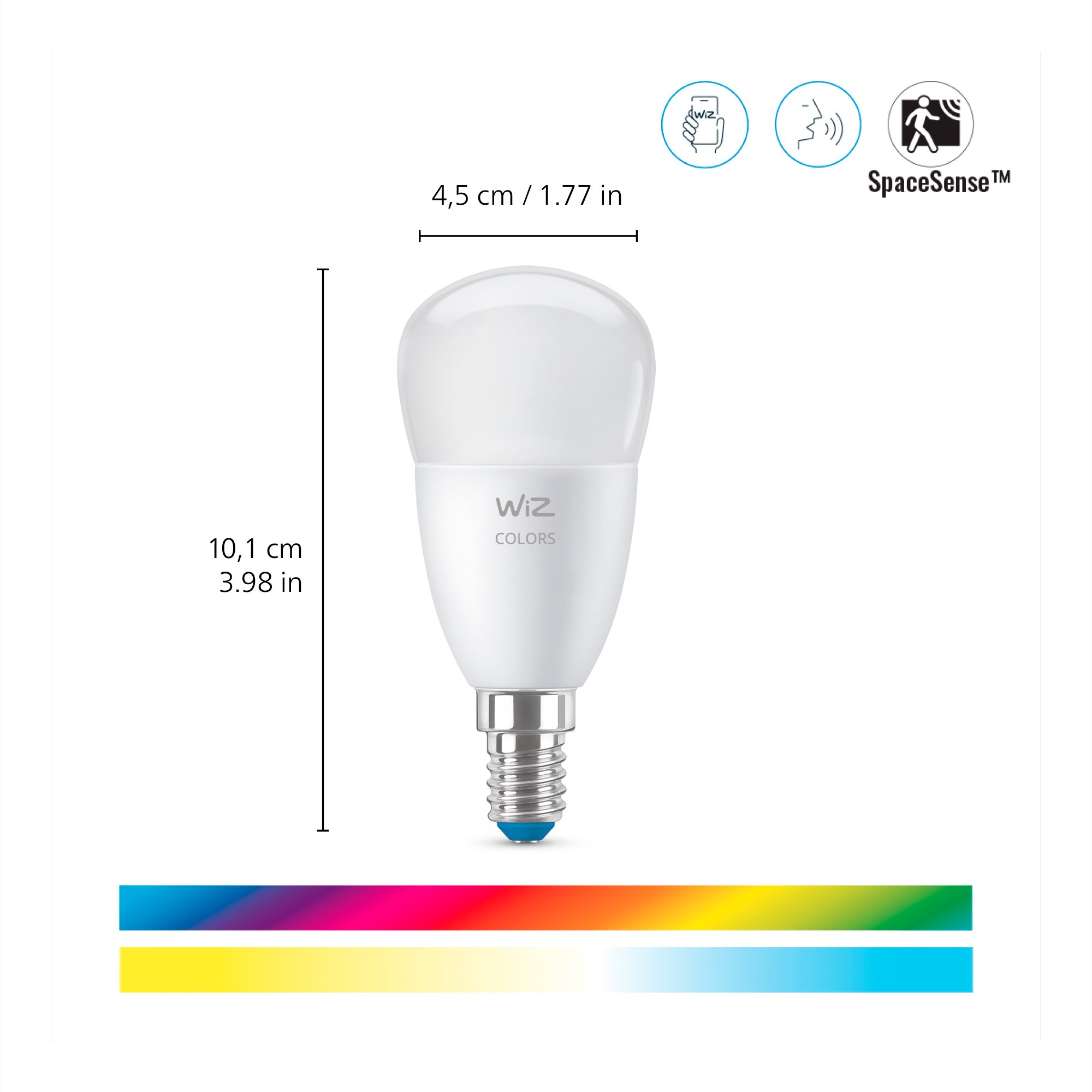 Få hjemmet ditt til å glitre med strålende fargerik stemningsbelysning med serien av WiZ full color intelligente pærer. Med denne lyspæren kan dine mindre lamper med E14 sokler lyse i 16 millioner farger og med den helt rette lysfargen, så du endelig får LED-belysning i fantastisk høy kvalitet, som du fortjener. La deg fascinere av komforten og bekvemmeligheten av Circadian Rhythm-funksjonen, som følger lysenes naturlige mønster og skaper en jevn overgang fra klart dagslys til dempede varme toner av hvitt, slik at belysningen hjelper deg til en forbedret følelse av velvære. Og opplev hvordan dynamiske lysfunksjoner bader hjemmet ditt i vakre flerfargede lyseffekter, som for eksempel reflekterer havet eller en glødende peis, og som skaper en fortryllende stemning til alle hverdagens øyeblikk. Med den gratis, brukervennlige WiZ-appen får du enkel kontroll over din intelligente belysning, og du kan også styre lyset med stemmekontroll via smarttelefonen din eller en stemmeassistent. La WiZ hjelpe deg med å automatisere belysningsbehovene dine og ta seg av alle dine daglige rutiner for deg. Det har aldri vært enklere og morsommere å ha den perfekte belysningen til alle anledninger.