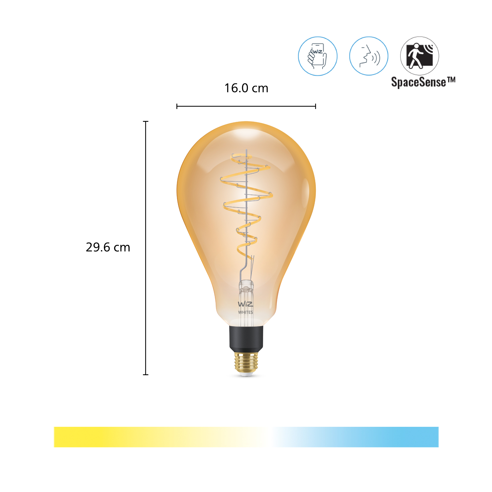 WiZ Filament Amber Tunable White Wi-Fi PS160 E27 er en vakker pæreformet stor pære med synlige LED-tråde, tonet ravgult glass og i dette tilfellet en E27-fatning. Den kan med sine synlige LED-tråde betegnes som den moderne, klassiske pæren, da den ligner de gammeldagse glødepærene både i design og lys egenskaper. WiZ Filament Amber Tunable White Wi-Fi PS160 E27-pæren kan justeres i lystemperatur fra kald til varm hvit mellom 2000 kelvin og 5000 kelvin og den lyser opp til 390 lumen. Via den trådløst tilkoblede appen kan du øke eller dempe lysstyrken med smarttelefonen din. Selv om det er en stor pære, gjør LED-trådene den til en naturlig energisparepære med lang holdbarhet og levetid samt energimerke "A". Det betyr at den kun bruker 6,5 watt og tilsvarer en gammeldags 25-watts pære i lysstyrke, og den har en levetid på 15.000 timer.