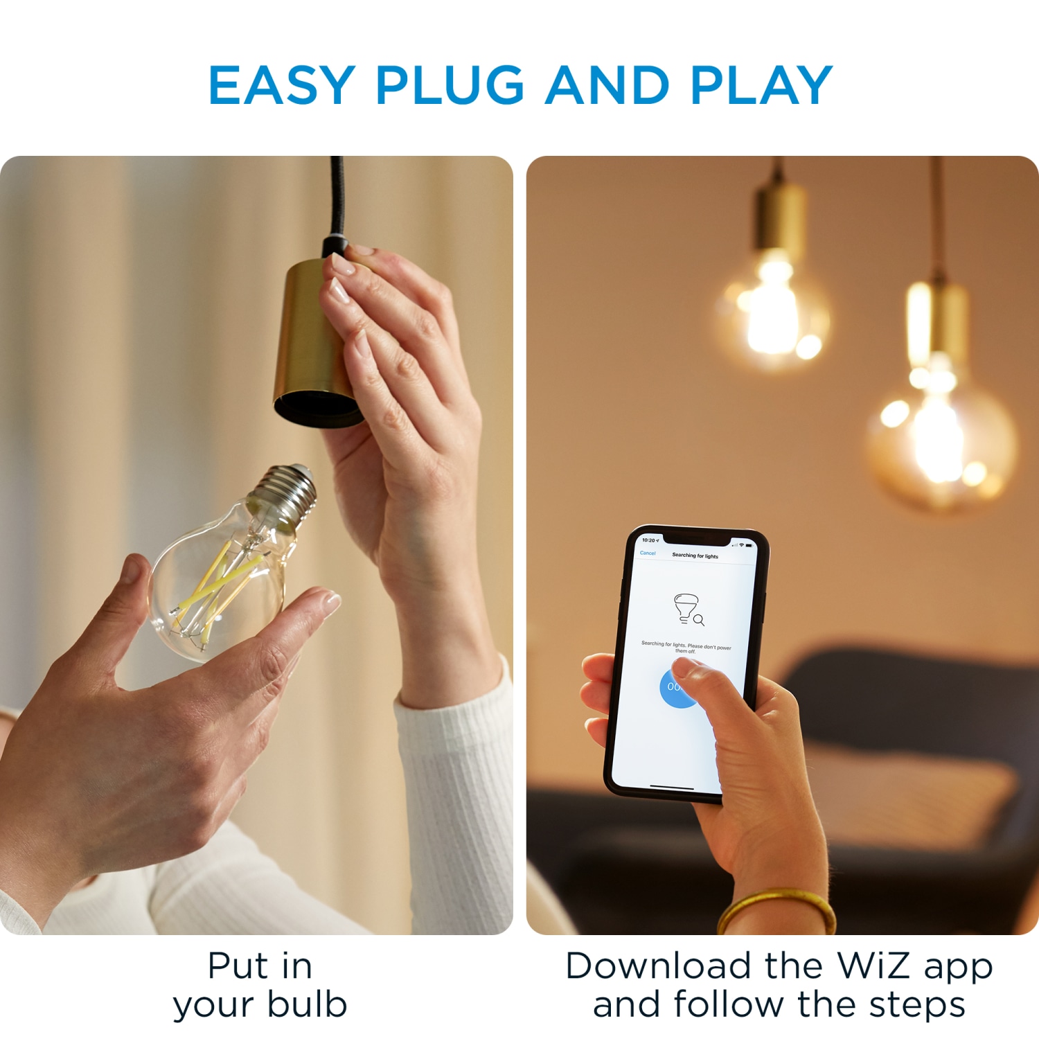 WiZ kobles direkte gjennom WiZ-appen og direkte til hjemmets 2,4 GHz trådløse nettverk uten hub (fungerer også med Wi-Fi Mesh), og de er superenkle å koble sammen. Du trenger bare å følge instruksjonene på appens skjerm. Så er du klar på null komma niks. Du kan koble til så mange lys du vil, samtidig og få en komplett WiZ-installasjon i hjemmet.