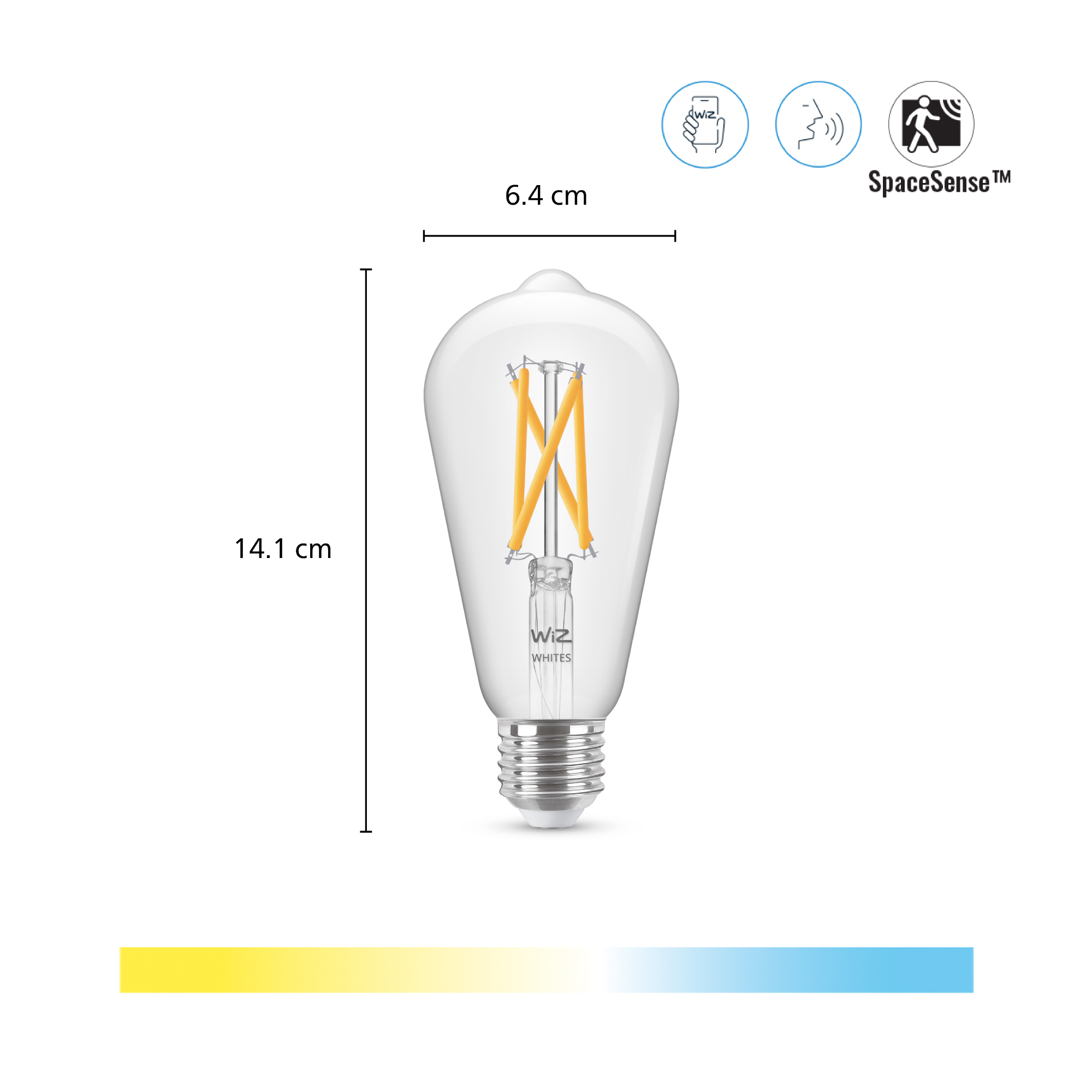 WiZ Filament Clear Tunable White Wi-Fi ST64 E27-pæren kan innstilles i temperaturer fra kald til varm hvit på mellom 2200 kelvin og 5500 kelvin, og den lyser opp til 806 lumen. Via den trådløst forbundne appen kan du øke eller dimme lysstyrken med smarttelefonen din. Selv om det er en stor pære, gjør LED-trådene den til en naturlig energisparepære med lang holdbarhet og levetid samt energimerke E. Det betyr at den kun bruker 7,5 watt, noe som tilsvarer en 60-watts pære i lysstyrke, og den har en levetid på 15.000 timer.