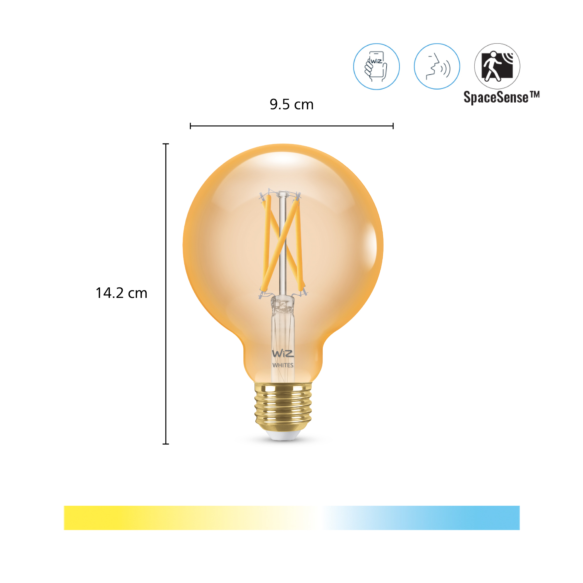 Funksjoner og spesifikasjoner for WIZ filament LED lyspære G95 E27, amber