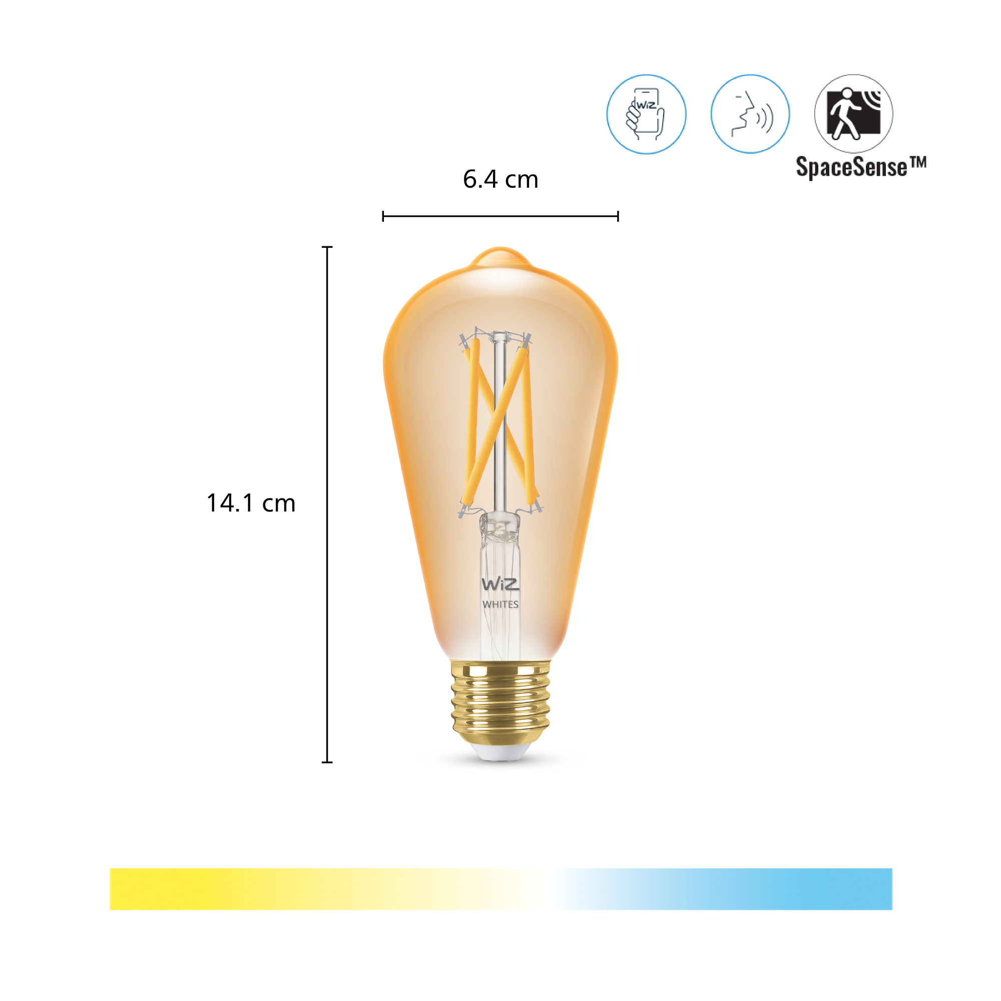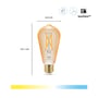 Filament Ravgul ST64-pæren er en rett rørformet pære og i dette tilfellet med en klassisk E27-sokkel. Den kan med sine synlige LED-tråder og tonet ravgult glass betegnes som den moderne, klassiske pæren, da den ligner de gammeldags glødepærene i både design og lysegenskaper. Filament Ravgul ST64-pærens temperatur kan via den trådløst tilkoblede appen innstilles fra kald til varm hvit mellom 2200 og 5500 kelvin og lyse opp til 650 lumen. Via den trådløst tilkoblede appen kan du øke eller dempe lysstyrken med smarttelefonen din. Selv om det er en stor pære, gjør LED-trådene den til en naturlig energisparepære med lang holdbarhet og levetid samt energimerke "A". Det betyr at den kun bruker 7,5 watt, hvilket tilsvarer en gammeldags 50-watts pære i lysstyrke, og den har en levetid på 15.000 timer.